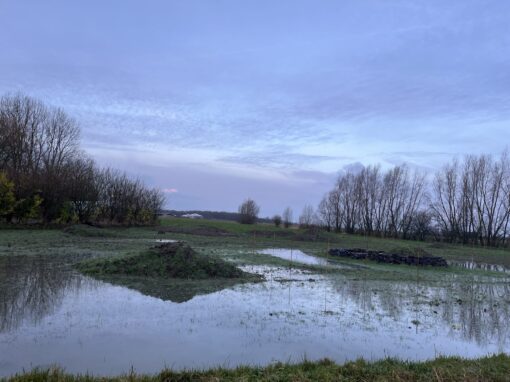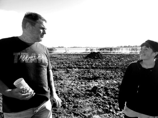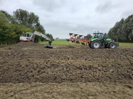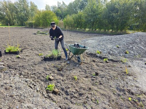 Samen met Hein Drost van de Friese Hortus “de Kruidhof” heb ik een beplantingsplan gemaakt met uitsluitend inheemse Friese klei-planten voor vogels, vlinders en bijen. Richard liet wadi’s graven en we maakten een smal houtsnipperpad, het enige stukje voor de mens, om door het veld te lopen.