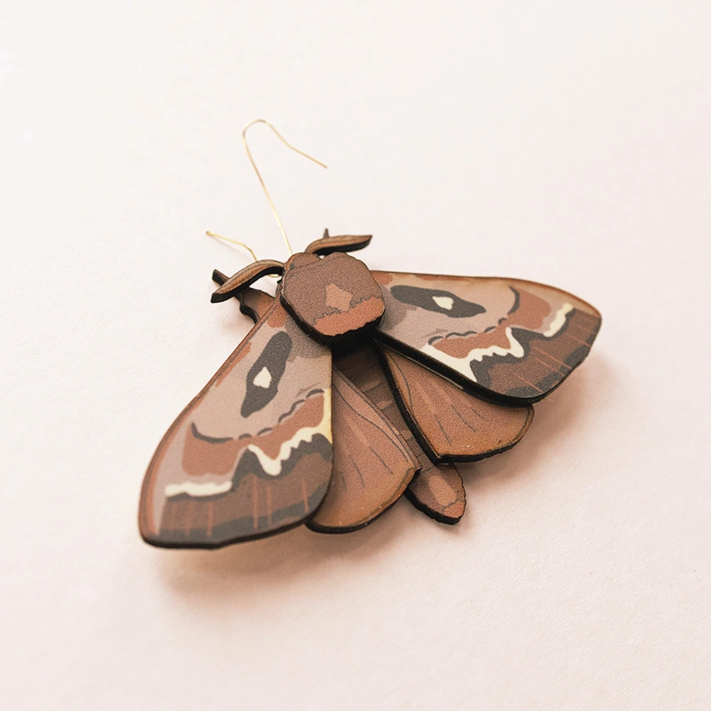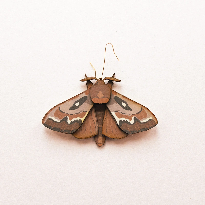 Maruschka heeft de dennenspinner getekend, en deze hebben we als duurzame PVC-vrije folie opgeplakt en uit hout gesneden.