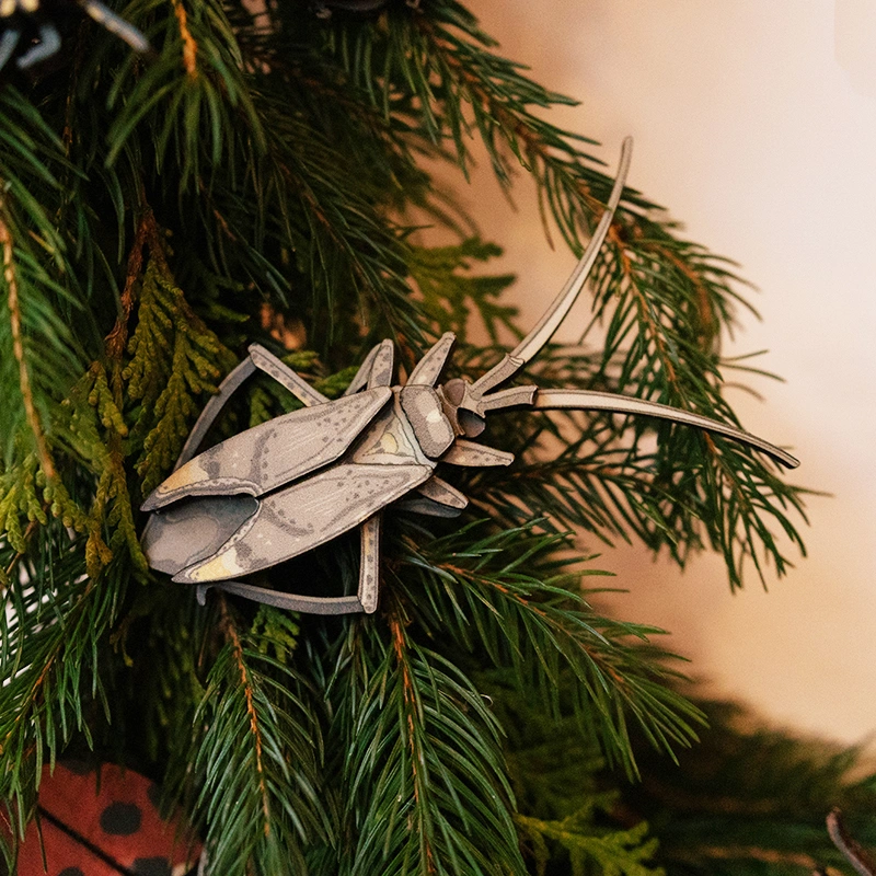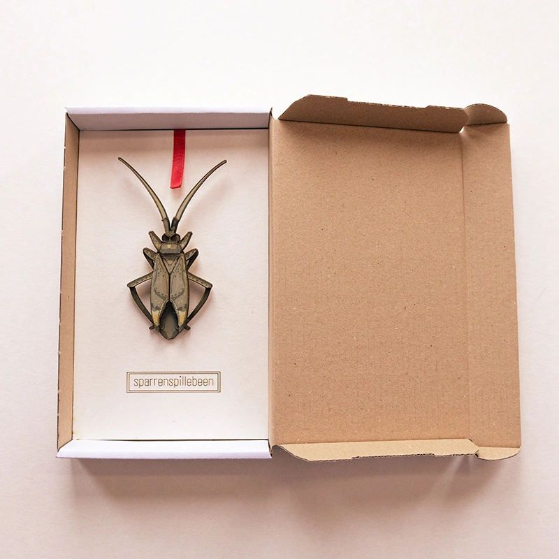 Haal de spillebeen in huis voor jouw boom! Dit is een handgemaakt, houten ornament met een clipje op de achterkant waarmee je hem aan een dennentak kan bevestigen.